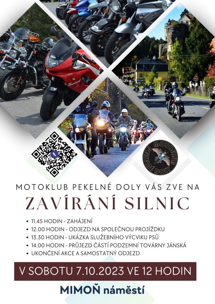Zveme vás na akci ZAVÍRÁNÍ SILNIC tj. na ukončovací JÍZDU z Mimoně (tato ukončovací jízda nesouvisí s uzavřením jeskyní Pekelné doly).